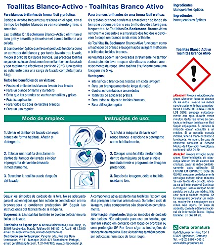 In de loop van de tijd worden witte kledingstukken aan veel wascycli onderworpen en resten in de reinigingsmiddeloplossing blijven, krijgt het textiel een grijze kleur. Bovendien kan er een lelijke gele steek optreden, als deze kleding gedurende een langere periode bewaard wordt. De Dr. Beckman Active White doeken met hun geavanceerde combinatie van optische glansmiddelen bestrijden betrouwbaar vergeling en vergeling en laten de witte was weer stralend wit worden.