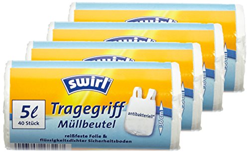 Inhoud: 4 rollen Swirl vuilniszakken met draaggreep, 5 liter met elk 40 zakken per rol, afmetingen zak: 33 x 36 cm, merkkwaliteit