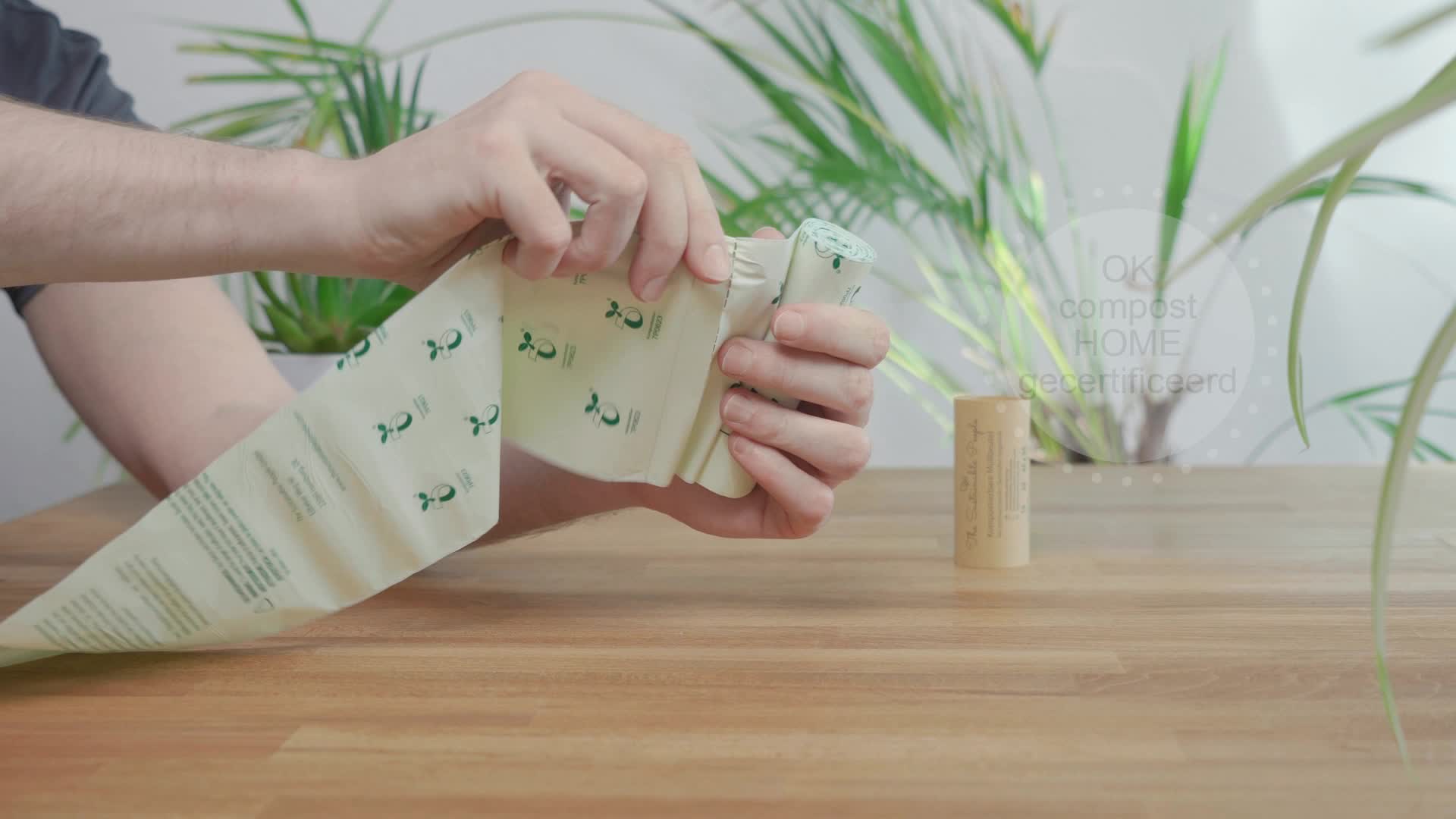 Composteerbaarheid: 100% composteerbaar thuis op je eigen compost en biologisch afbreekbaar, banderol van FSC-gecertificeerd materiaal